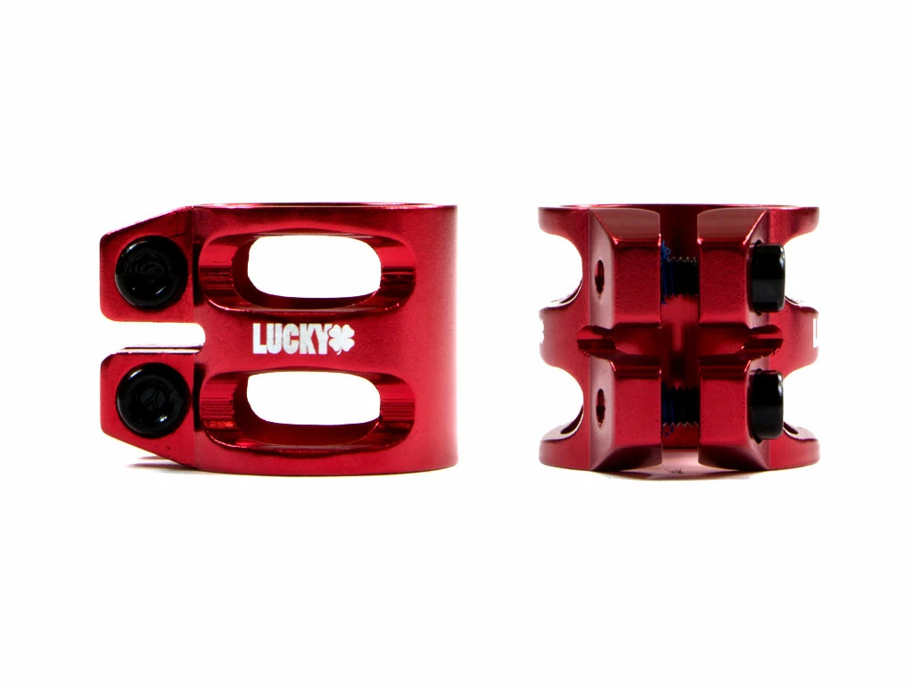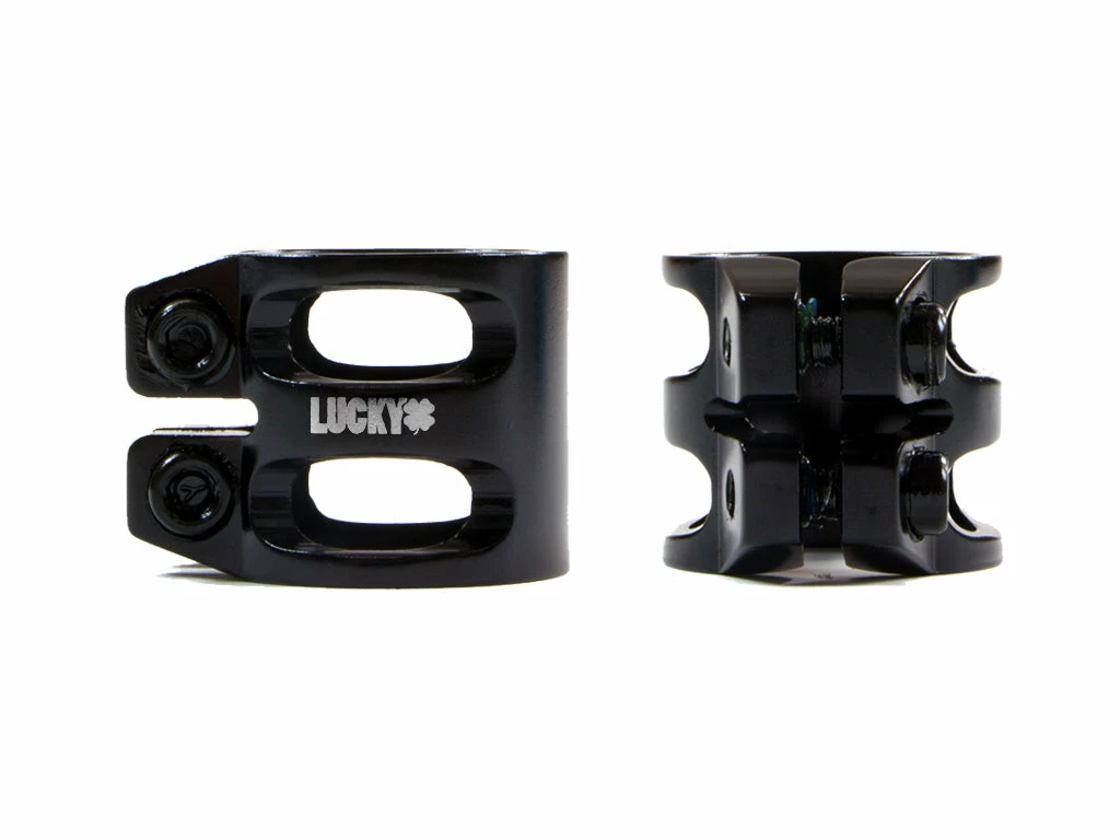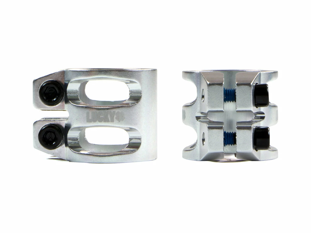 The Lucky DUBL™ Clamp is a lightweight and creatively designed pro scooter clamp. We start with the best 6000 series aircraft aluminum and CNC machine it to final specs. We drilled the bolt holes extra deep to avoid stripping and use top of the line hardened bolts.