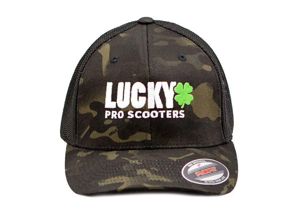 Lucky Solid Logo Curved bill Multi Cam Hat- Original Flex Fit OSFA dark camo hat with OG logo