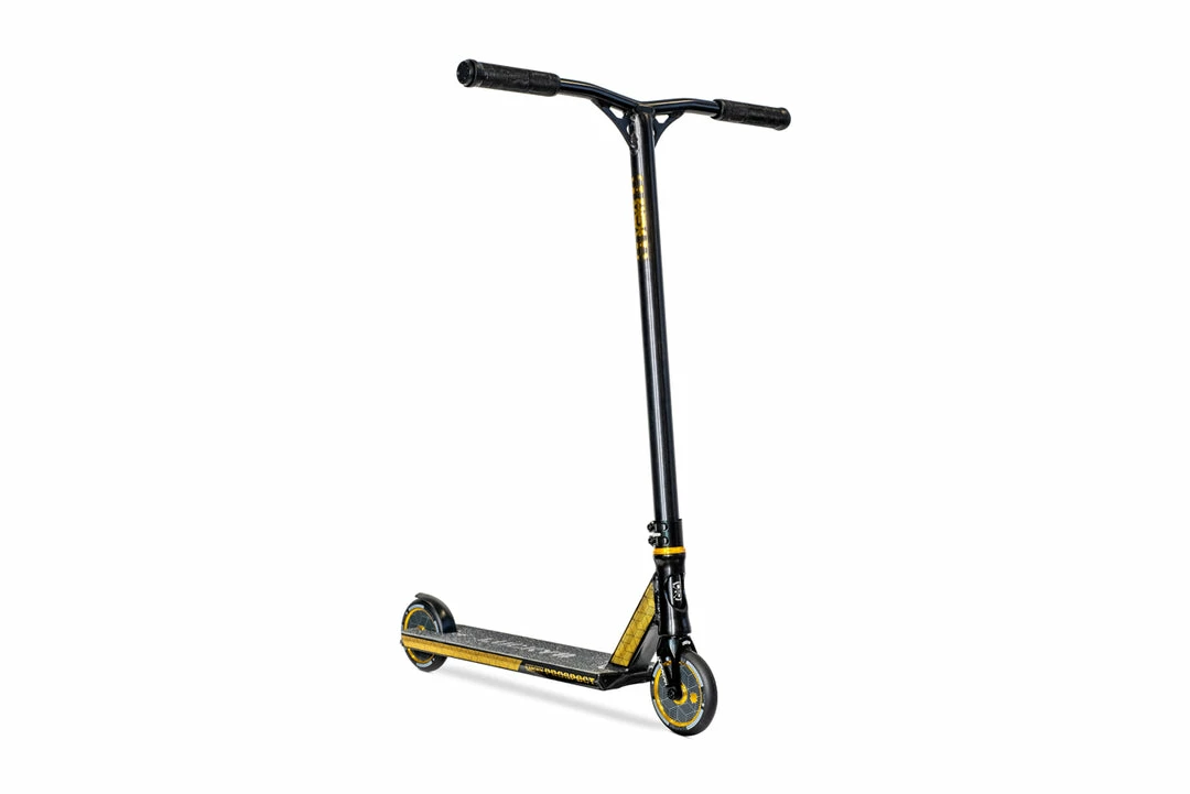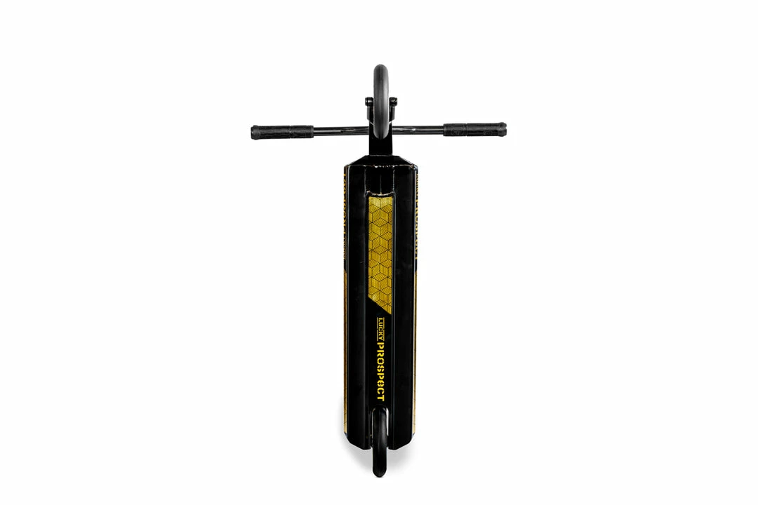 The 2022 PROSPECT™ – Lighter, bigger and better than ever!The 2022 PROSPECT™ comes equipped with an all new Aluminum HexBar™ at 24.5” (622mm) Tall and 23.5” (597mm) Wide, a Black Anodized IHC Huracan™ Fork, and a 19.5” (495mm) Long and 4.8” (122mm) wide deck with an all new plated front end. Also new for 2022 are the 120mm Lunar Hollow Core Wheels. Weighing in at only 7lbs (3.1 kgs), the PROSPECT™ is our lightest out of the box complete pro scooter. Keeping with the much loved PROSPECT™ style and design this complete pro scooter stands out with rich anodizing and clean graphics designed by industry legend Ryan Upchurch. Take it straight from the box to the park, and go BIG! This scooter just might make you the next prospect for the Lucky team