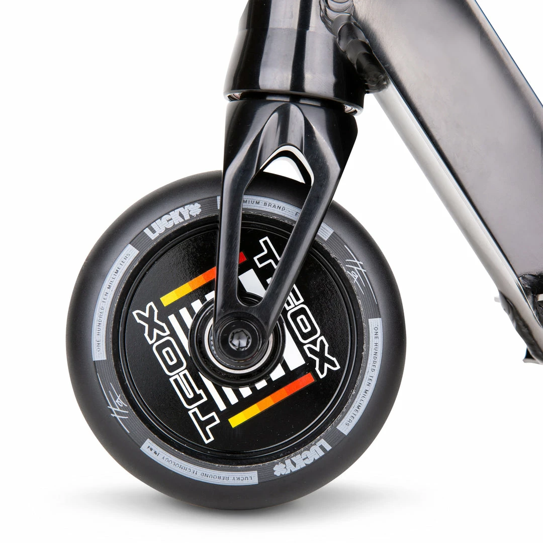 The 2022 Tanner Fox TFOX™ Analog V2.0 Sig Complete Pro Scooter uses the same deck as the legendary Prospect™ made from aircraft-grade 6061 aluminum that gets hit with a robotic TIG weld for exceptional strength and durability. New for 2022, the deck is now wider at 4.8″ (122mm) and 19.5” (495mm) long. It comes with aluminum Kink Bars that are 24” (610mm) tall and 23” Wide (584mm), Black anodized Huracan™ IHC fork and our Lunar hollow core wheels tie it all together. The graphic designs were a collaboration with Lucky and Tanner that resulted in color combo and style all his own.